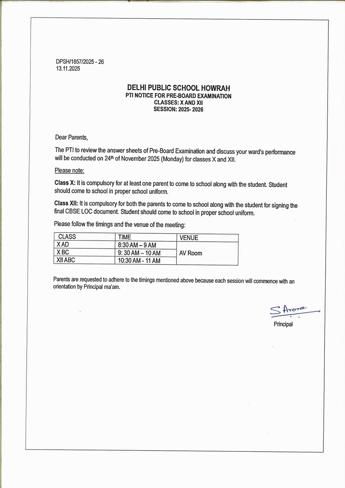 Notice 1005 SCHEDULE FOR THE PRE BOARD 2 TERM 1 EXAM